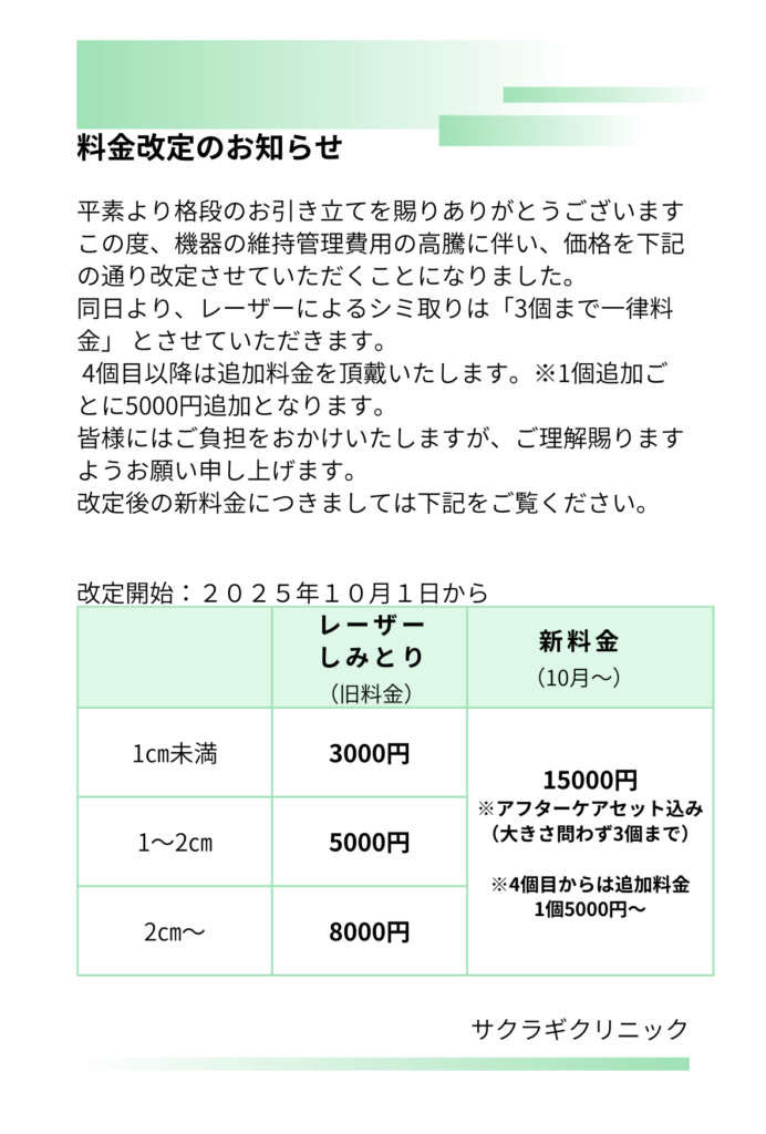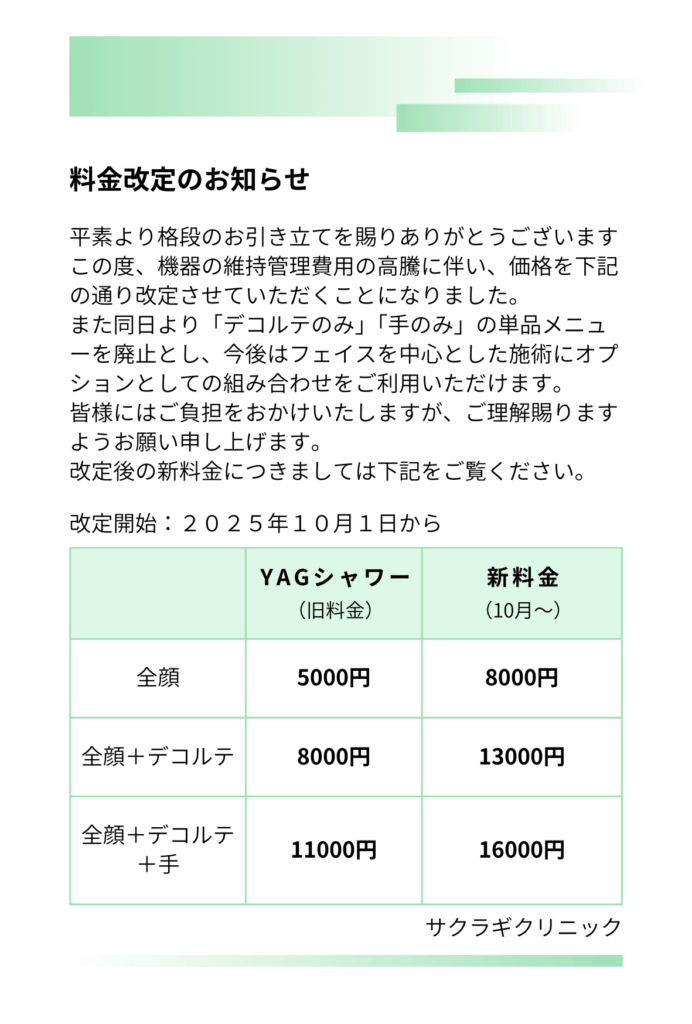美容施術料金の改定のお知らせ